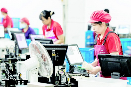 10月11日,在裕安区新安镇的宇翔体育用品有限公司生产车间内,工人们正在生产线上紧张忙碌着。