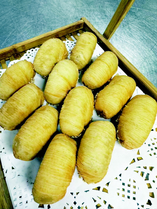 酥皮的制作,是对我作为酒店面点师功底的考验。水油皮与油酥的缠绵,是一场力与美的平衡之舞。水油皮要揉到“面光、手光、盆光”,筋道十足才经得起反复折叠。包酥时,将水油皮擀成薄片,裹入油酥,一遍遍折叠、擀压,让酥层在指尖层层绽放——力度轻了,层次混沌;力度重了,油酥渗出。唯有恰到好处的拿捏,才能成就入口即化的酥脆。