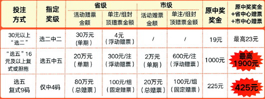 省级:活动期间,凡在安徽省福彩销售网点购买单票金额30元及以上的“选二”投注方式的彩票和单倍金额16元及以上的“选五”玩法复式或胆拖投注的快乐8游戏彩票中指定奖级后可参与赠票活动。