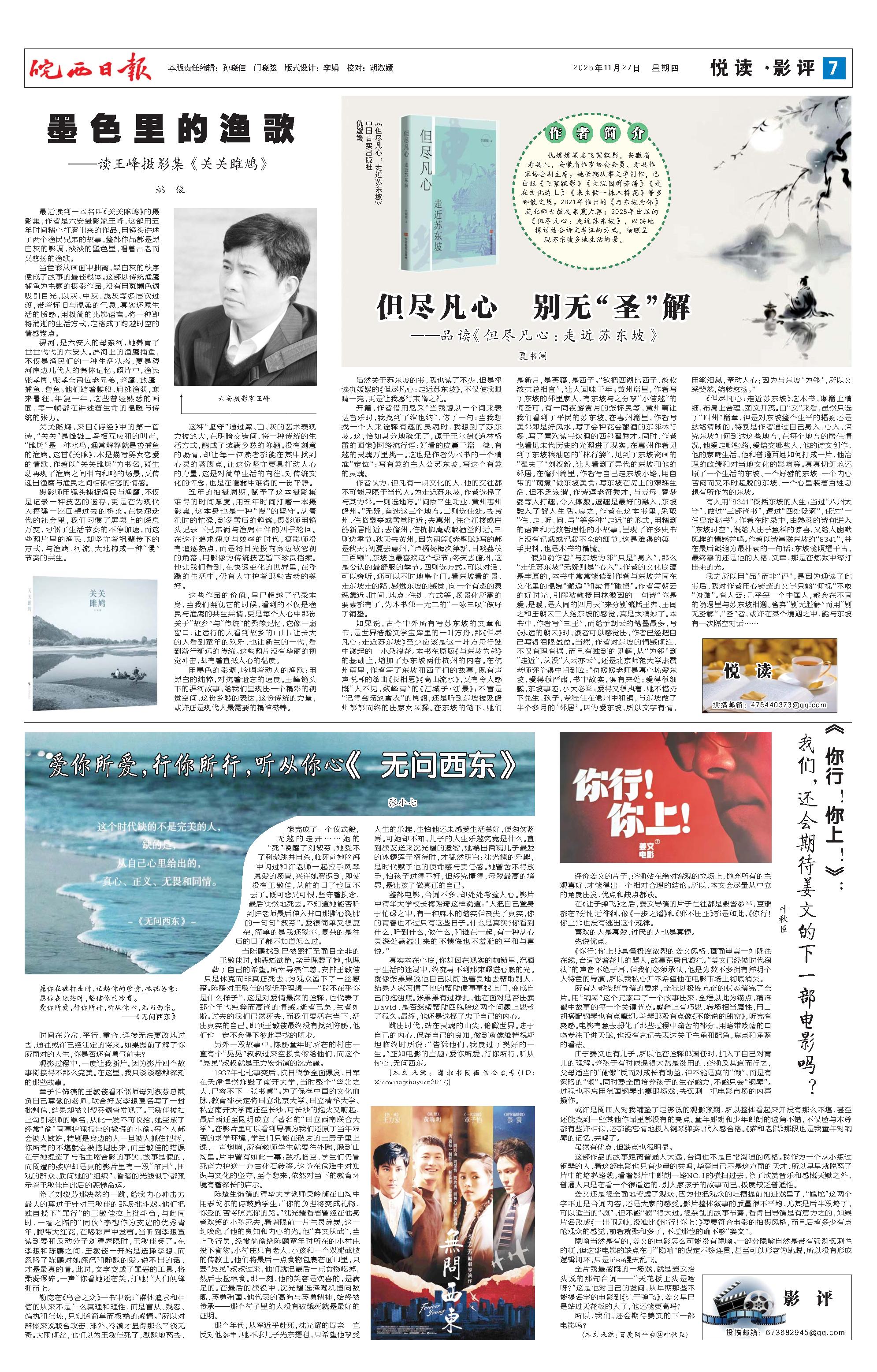 陈楚生饰演的清华大学教师吴岭澜在山沟中用泰戈尔的诗鼓励学生:“你的负担将变成礼物,你受的苦将照亮你的路。”沈光耀看着曾经在他身旁欢笑的小孩死去,看着眼前一片生灵涂炭,这一切唤醒了他的良知和内心的光。他“弃文从武”,当上飞行员,经常偷偷给陈鹏童年时所在的小村庄投下食物。小村庄只有老人、小孩和一个双腿截肢的传教士。他们将最后一点食物包裹在面巾里,只要“晃晃”叔叔过来,他们就把最后一点食物吃掉,然后去捡粮食。那一刻,他的笑容是欢喜的,是满足的。在最后的战役中,沈光耀选择驾机撞向敌舰,英勇殉国。他代表的高尚与英勇精神,始终被传承——那个村子里的人没有被饿死就是最好的证明。