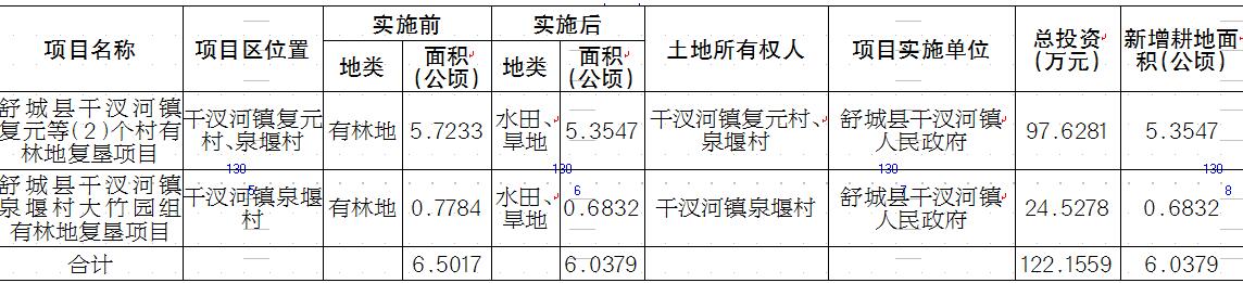 为统筹城乡发展,促进土地节约集约利用,依据《土地复垦条例》(国务院令〔第592号〕)要求,我局组织实施了舒城县干汊河镇复元村、泉堰村有林地复垦新增耕地项目,项目于2017年5月立项,2017年6月实施,2017年8月竣工,现拟申报市局验收,特予以公示。
