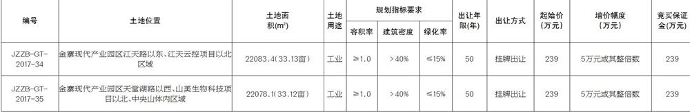 挂牌时间:JZZB-GT-2017-34、35号地块分别为2017年11月17日8时至2017年11月29日15时、15时30分。