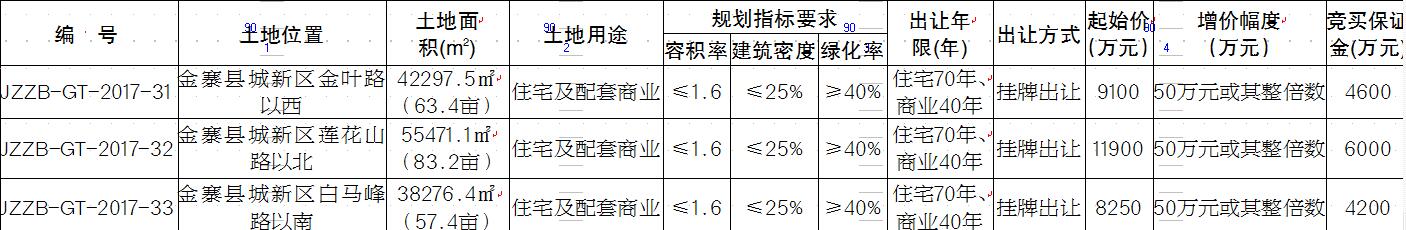 挂牌时间:JZZB-GT-2017-31、32、33号地块均为2017年11月28日8时至2017年12月13日16时。