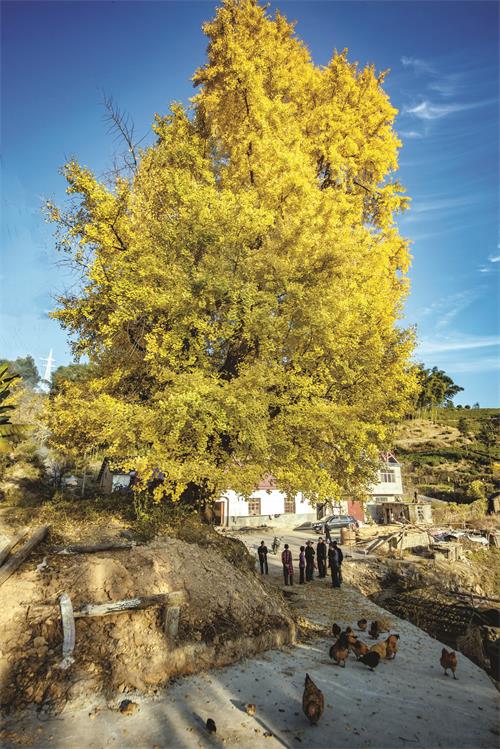 耸立于江院庄前的这株古银杏,树龄高达600年,炎炎夏日浓荫覆盖,深秋时节一片金黄,被江院人视为珍宝。由于年长日久、风风雨雨,致使该株银杏根部泥土流失。为使古树能更好地生长和防止意外发生,几位江院的江姓老人趁着当前农闲,为古树砌岸、填土。 张光照 张志声/文图