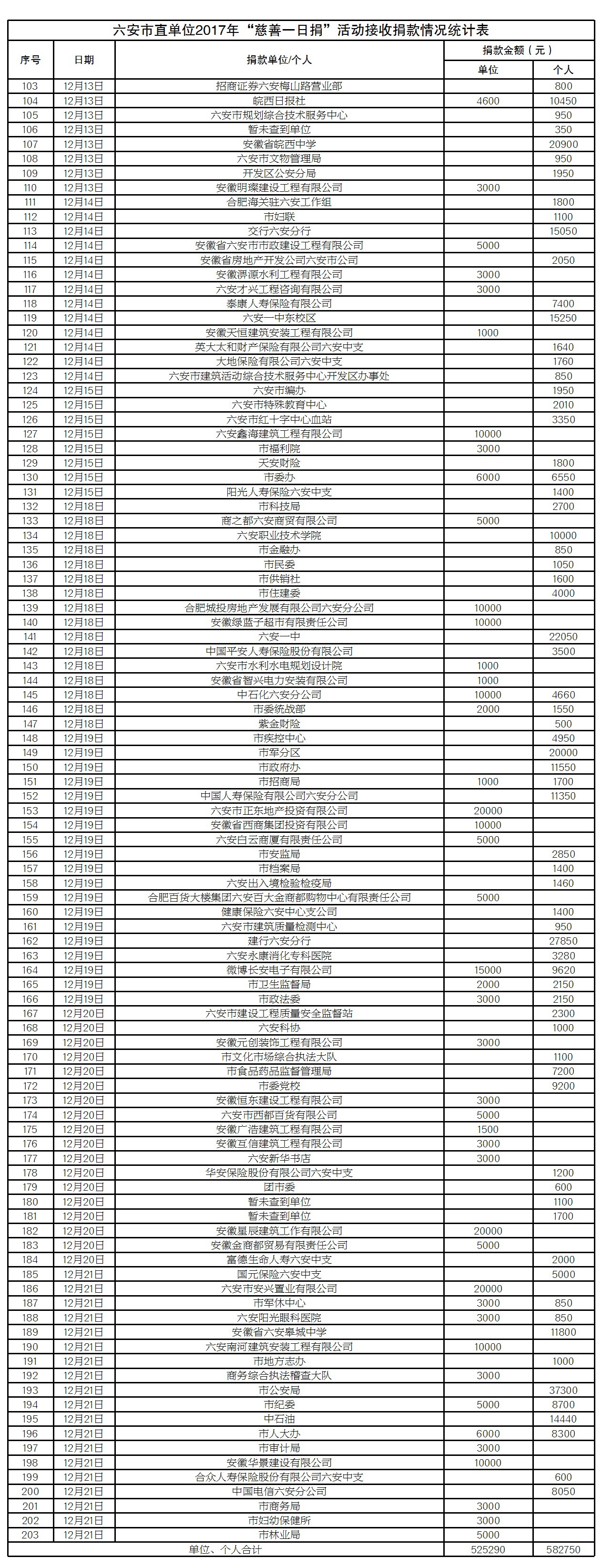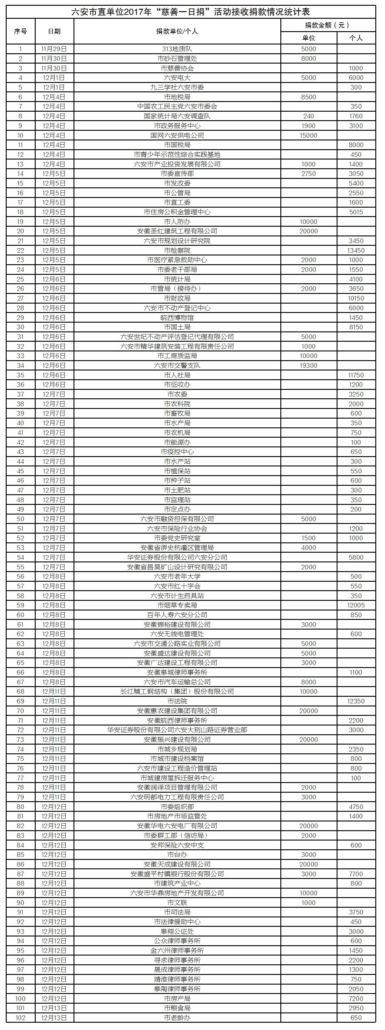 六安市直单位2017年“慈善一日捐”活动捐赠情况进度公告