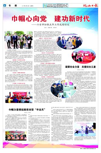 市委把妇联工作摆在重要位置,召开群团工作会议,研究出台《关于进一步加强工会、共青团、妇联工作的意见》、《六安市妇联改革方案》,定期听取工作情况汇报,及时解决妇联工作遇到的困难和问题,为新时期妇联工作指明了方向。妇女参与决策和管理的水平不断提高。市人大女代表和政协女委员分别占代表委员总数的27%和27.1%,全市女干部总数3289人,占干部总数的22.47%,其中县处级女领导干部148人。市政府深入贯彻男女平等基本国策,把妇女儿童发展纳入经济社会发展总体规划,召开全市妇女儿童工作会议,落实妇女工作专项经费,务实推进妇女儿童事业。市人大常委会、市政协多次就妇女工作开展调研指导,督办涉及妇女儿童的提案、议案,为妇联工作提供支撑。