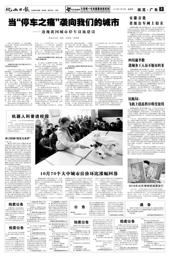 当“停车之痛”袭向我们的城市——透视我国城市停车设施建设⊙四川逾半数进城务工人员不愿农转非⊙民航局:飞机上扰乱秩序将受处罚⊙10月70个大中城市房价环比涨幅回落⊙安徽首批省级公车网上拍卖⊙机器人科普进校园⊙2016年北京博物馆通票发行⊙⊙⊙⊙