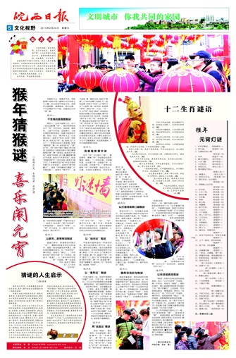 羊踏彩云去,猴携灵气来。贺新春猜灯谜是中国人喜闻乐见的传统文化大餐,在元宵佳节来临之际,亲朋好友要相聚,猜猜猴谜,即时应景,不仅会增添节日气氛,还能品出无穷“猴”趣。