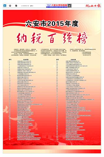 六安市2015年度纳税百强榜