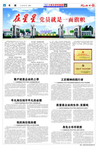 在抓好“党员先锋岗”、“党员示范岗”和“党员责任区”等日常活动开展的同时,坚持每年都认真组织开展优秀员工、先进工作者、先进班组,优秀共产党员、先进党务工作者和“双强六好”党支部等评选表彰活动。2014年五一期间,集团党委、工会、团委联合在金安区政府行政会议中心二楼大礼堂召开了“三项表彰”大会,对年度优秀党员、员工进行了集中表彰,取得了较好的效果。同时,为进一步树立典型,2014、2015年,集团党委分别在《皖西日报》上以《党员耀星星》和《星星,党员展现正能量》为题,刊登了近20名优秀共产党员的先进事迹。通过先进模范、典型人物的挖掘选树和广泛宣传,集团上下形成了一个向党员模范看齐,比学赶帮超,争当先进的良好氛围,涌现出一大批优秀党员和员工。旅游用品公司章永花被全国总工会评为国家级劳动模范;服装公司副总经理管良中被市劳动竞赛委员会、市总工会授予“五一”劳动奖章,服装公司班组长魏多苹被市总工会评为“最美农民工”,并被授予市“五一”劳动奖章;服装公司仓库副主任时培山被金安区委评为“全区为民服务创先争优标兵”;爱星纺织品公司机修工吴然好被共青团六安市委、六安市青年志愿者协会评为“全市优秀青年志愿者”。集团党委书记、董事长管传玉,因其骄人的业绩,被授予首届优秀中国特色社会主义事业建设者,安徽省劳动模范,全省关爱员工优秀民营企业家和优秀共产党员等多项荣誉称号。