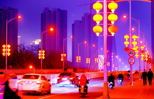 1月14日,夜幕降临的市区八公山路淠史杭大桥段,大红灯笼与来往车流、行人相映成景流光溢彩。春节将至,红灯笼、中国结、各式彩灯扮靓皋城大街小巷,为老区节日增添了更多亮丽元素,营造出红火喜庆的浓浓年味。 本报记者 田凯平 摄
