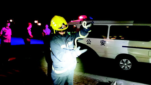近日,六安经济技术开发区消防救援大队接到报警,金安区三十铺镇双墩村琥珀山庄有蛇出没,请求帮忙处置。随后,大队立即出动1辆抢险车和7名指战员迅速赶赴现场。 到达现场后,发现有一条蛇躲在大厅柜子下面,消防指战员通过观察该蛇是属于乌梢蛇的一种,无毒、长度约有1米左右,呈乌黑色。为保证当地工作人员的人身安全,指战员立即展开抓捕行动。消防指战员先用双脚压住蛇的尾部和头部,再慢慢捏住蛇头,不到30秒钟成功将蛇抓到。 消防部门提醒,夏日气温高,蛇类贪凉,要谨慎家中的阴凉区域,外出时一定要注意安全,如果家中发现有蛇,可拨打119求助,不要擅自捕捉或追打蛇,以免造成不必要的人身伤害。 袁跃东 本报记者 王丽 摄