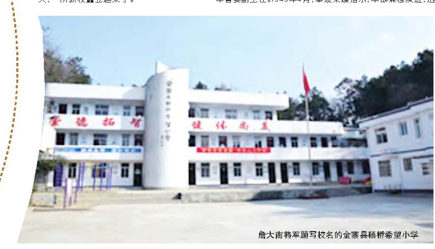 位于皖西边陲的金寨县素有“将军摇篮”之称,新中国成立后,被授予少将以上军衔的金寨籍开国将军就有59位,是全国第二大将军县。同时,由于受地理位置限制,这里的人民长期没有解决温饱问题,被确定为国家级贫困县,其中教育设施也一度处于落后状态,亟待改变。全国希望工程启动实施后,詹大南所在的家乡领导考虑通过申请的形式,争取资金支持兴办希望小学,改善教学条件,而申请的获批,免不了要请金寨籍老将军帮帮忙。詹大南就在其中。 有一次,县领导托人转达詹大南将军,想申请经费建一所小学。詹大南与老伴商议,发动全家一起为家乡捐建一所希望小学。 老将军的爱人李凡也是一位抗日老战士,她非常理解、支持丈夫的想法。其实,老将军夫妇的子女们也多是工薪阶层,经济也不宽裕,但他们对父母的倡议都非常赞同。 随即,詹大南夫妇拿出他们一生积攒的4.2万元,子女们你1万他5000,全家总计捐款10万元。资金很快送到家乡,由县希望工程办公室及教育主管部门具体负责建校。不久,一所新校矗立起来了。 后来,在希望小学的定名上,县委、县政府拟命名为“詹大南小学”。可是,老将军坚决不同意。他说:“不行,不行,共产党人就是为人民做事的,不图名不图利,希望小学就是希望小学,是我们真心把希望寄托在下一代。”尊重老将军的意见,将学校命名为“金寨县杨桥希望小学”,老将军还亲笔题写了校名。 此外,他还在金寨一中设立了奖学金,在自己战斗过的地方资助了50多名失学儿童,尽力为希望工程添砖加瓦、贡献力量。 一位受助的学生在给老将军的信中写道:“亲爱的爷爷、奶奶,1996年,当我和小伙伴们因家庭困难即将离开学校时,是你们给我送来了学费和书本,我爸爸妈妈、爷爷奶奶都感动得掉了眼泪。你们给了我希望!” 一位受助孩子的父亲在给老将军的信说:“您老平日十分俭朴,还想着我们老区人民,我们一定教育孩子好好学习,不辜负您老人家的厚望!告诉您老人家一件好事,继你们的捐款后,又有两家单位给我们捐款了。” 詹大南,1915年4月生,安徽省金寨县槐树湾乡杨桥村人。1929年,先后参加少先队、革命互济会、反帝大同盟等革命组织。1931年2月,参加中国工农红军,第一仗就是攻打河口集和叶集;4月,任红十二师补充营通讯班班长。1932年3月,任二二五团二营通讯班班长,同年5月加入共青团。1934年3月,调到红二十五军给军长徐海东当警卫员。11月,参加北上长征,1935年9月,红二十五军胜利到达陕北,参加劳山、榆林桥、直罗镇等重大战役。1936年,加入中国共产党。 抗日战争爆发后,先后任八路军一二〇师三五八旅七一六团政治处组织干事、一营特派员,随旅主力挺进晋西北。1938年4月,调至八路军第四纵队第十二支队三十六大队任总支书记兼特派员,不久担任四纵独立营教导员。1939年3月,奉命进入挺进军随营学校高级班学习,5月结业后,先后任挺进军十二支队三十六大队副政委、政委。9月,挺进军进行整训,改编为6个主力团,任九团二营营长。同年11月,调至挺进军教导大队任大队长,1941年,先后任挺进军司令部作战科长、八团团长,率部参加开辟和保卫平北根据地的斗争。1942年春,平北地区划为十二军分区,归晋察冀军区直接领导。先后任十二军分区副参谋长、参谋长。1944年10月,升任第十二军分区司令员。 1945年至1948年,历任张家口卫戍司令、晋察冀军区二纵独五旅旅长、冀热辽军区独立二师师长、冀热察军区代理司令员、察哈尔省军区副司令员兼张家口市首任警备司令和军管委副主任。1949年4月,奉聂荣臻指示,率部兼程疾进,迅速将大同包围,迫使国民党军1个主力师和13个县反动武装近2万人投降,和平解放大同。1949年5月,任华北军区直属二〇九师师长,12月调任三野九兵团二十七军副军长。 1950年11月,奉命率部赴朝鲜战场,参加第二、第五次战役。先后获朝鲜民主主义人民共和国二级国旗勋章2枚。 1952年,入南京军事学院高级速成班学习。毕业后,于1955年3月赴福建担任二十八军军长,守卫祖国的东大门。同年10月,被授予少将军衔,获三级八一勋章、二级独立自由勋章、一级解放勋章各1枚。1958年8月,亲自参与指挥金门炮战。1965年5月,调任兰州军区副司令员兼甘肃省军区司令员,1966年10月兼任中共甘肃省委书记。1970年12月,调任南京军区副司令员,并奉命主管南京空军工作。1982年,当选中共十二届中央纪律检查委员会委员。1988年,当选七届全国人大代表,同年荣获中央军委授予的一级红星功勋荣誉章。 离职休养后,仍关注国家改革开放大业和军队现代化建设,关心家乡经济建设和教育事业。