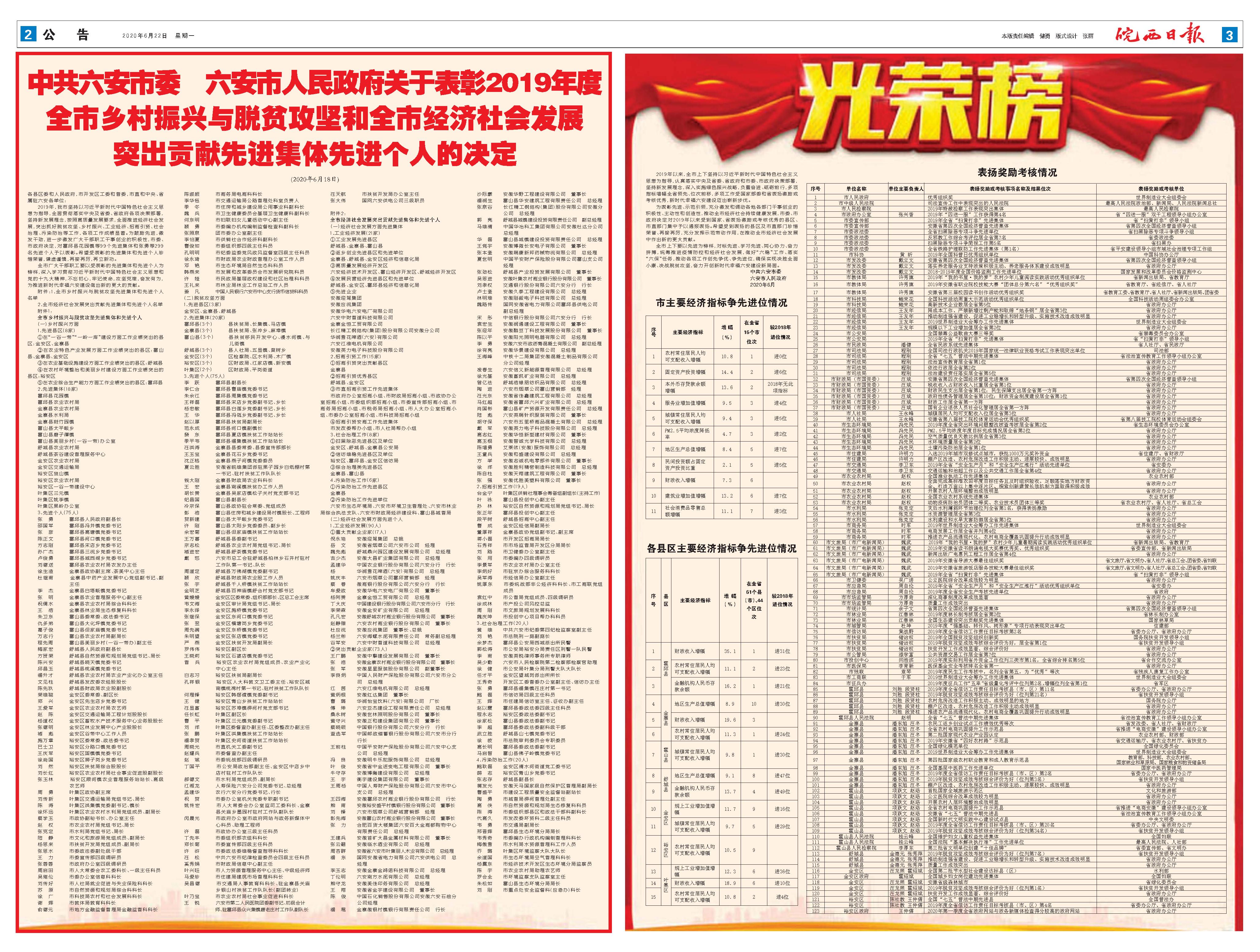 各县区委和人民政府,市开发区工委和管委,市直和中央、省属驻六安各单位: 2019年,我市坚持以习近平新时代中国特色社会主义思想为指导,全面贯彻落实中央及省委、省政府各项决策部署,坚持新发展理念,按照高质量发展要求,全面推进经济社会发展,突出抓好脱贫攻坚、乡村振兴、工业经济、招商引资、社会治理、污染防治等工作,各项工作成绩显著。为鼓励先进,激发干劲,进一步激发广大干部职工干事创业的积极性,市委、市政府决定,对霍邱县花园镇等99个先进集体和张勇等299名先进个人予以表彰。希望受表彰的先进集体和先进个人珍惜荣誉,谦虚谨慎,再接再厉,再立新功。 全市广大干部职工要以受表彰的先进集体和先进个人为榜样,深入学习贯彻习近平新时代中国特色社会主义思想和党的十九大精神,不忘初心,牢记使命,攻坚克难,奋发有为,为推进新时代幸福六安建设做出新的更大的贡献。 附件:1.全市乡村振兴与脱贫攻坚先进集体和先进个人名单 2.全市经济社会发展突出贡献先进集体和先进个人名单 附件1: 全市乡村振兴与脱贫攻坚先进集体和先进个人 (一)乡村振兴方面 1.先进县区(8家) ①在“一谷一带”“一岭一库”建设方面工作业绩突出的县区:金安区、金寨县 ②在农业特色产业发展方面工作业绩突出的县区:霍山县、金寨县、金安区 ③在农业基础设施建设方面工作业绩突出的县区:舒城县 ④在农村环境整治和美丽乡村建设方面工作业绩突出的县区:裕安区 ⑤在农业综合生产能力方面工作业绩突出的县区:霍邱县 2.先进集体(18家) 霍邱县花园镇 霍邱县农业农村局 金寨县农业农村局 金寨县水利局 金寨县斑竹园镇 霍山县太平畈乡 霍山县磨子潭镇 霍山县美丽乡村(一谷一带)办公室 舒城县农业农村局 舒城县茶谷建设管理服务中心 金安区农业农村局 金安区交通运输局 裕安区独山镇 裕安区农业农村局 裕安区一谷一带建设中心 叶集区三元镇 叶集区姚李镇 叶集区果岭办公室 3.先进个人(75人) 张 勇 霍邱县人民政府副县长 邵国军 霍邱县冯井镇党委书记 张 彦 霍邱县高塘镇党委书记 陈正文 霍邱县河口镇党委书记 方志刚 霍邱县宋店乡党委书记 孙广杰 霍邱县三流乡党委书记 卢俊勇 霍邱县城西湖乡党委书记 刘德送 霍邱县农业农村局农发办主任 徐生造 金寨县政协副主席、茶美中心主任 杜继甫 金寨县中药产业发展中心党组副书记、副 主任 李 杰 金寨县白塔畈镇党委书记 张 明 金寨县农业管理服务中心副主任 祝儒水 金寨县农业农村局综合科科长 王 浩 金寨县林业局生态修复科科长 朱卫东 霍山县委常委、政法委书记 仇多弟 霍山县大化坪镇党委书记 葛子俊 霍山县但家庙镇党委书记 万志行 霍山县农业农村局副局长 程先周 霍山县美丽乡村(一谷一带办)副主任 梅家宏 舒城县人民政府副县长 方贤荣 舒城县自然资源和规划局党组书记、局长 陈兴安 舒城县晓天镇党委书记 邱昌玉 舒城县桃溪镇党委书记 潘升才 舒城县农业农村局农业产业化办公室主任 文见柱 舒城县发改委农经股股长 陈先玖 舒城县财政局农业股副股长 荣维聪 金安区委常委、副区长 郑 兴 金安区先生店乡党委书记 王爱军 金安区农业农村局农艺师 赵 陈 金安区交通运输局工程计划股股长 杨道权 金安区畜牧水产技术服务中心业务股股长 张德明 金安区林业发展中心产业股股长 褚 彪 金安区谷带中心工作人员 施万章 裕安区委常委、政法委书记 巴士卫 裕安区分路口镇党委书记 王庆军 裕安区固镇镇党委书记 徐尚国 裕安区狮子岗乡党委书记 刘 然 裕安区扶贫局综合股股长 刘长红 裕安区农业农村局社会事业促进股副股长 张玉林 裕安区顺河镇农业管理服务站站长、高级 农艺师 周 勇 叶集区政协副主席 刘传新 叶集区交通运输局党组书记、局长 陈 涛 叶集区洪集镇党委副书记、镇长 徐怀远 叶集区农业农村水利局党组成员、副局长 蔡学玉 市政协副秘书长、办公室主任 赵 权 市农业农村局党组书记、局长 张克定 市水利局党组书记、局长 陆 静 市文化和旅游局党组成员、副局长 杨思来 市扶贫开发局党组成员、副局长 张思水 市委政法委副处级干部 王 力 市委宣传部四级调研员 张蓉蓉 市政府办公室四级调研员 周启田 市人大常委会农工委科长、一级主任科员 吴绪伦 市委办公室信息科科长 刘传好 市人社局就业促进与失业保险科科长 苏 原 市自然资源和规划局综合科科长 徐 广 市科技局农村和社会发展科科长 谢 辉 市教体局教育科科长 俞德元 市地方金融监督管理局金融监管科科长 陈淑颉 市商务局电商科科长 李华钰 市交通运输局公路管理处科室负责人 季 冬 市住房和城乡建设局公用事业科副科长 魏 兵 市卫生健康委员会基层卫生健康科副科长 何东明 市妇联妇女儿童活动中心副主任 顾 勇 市委编办机构编制监督检查科副科长 张照泉 团市委办公室副主任 李伯夏 市供销社合作经济科副科长 曹俊如 市委组织部四级主任科员 孔明明 市纪委监委党风政风监督室四级主任科员 徐永琦 市财政局农业财政管理办公室工作人员 邓 艳 市生态环境局自然生态科科员 韩燕来 市发展和改革委员会市发展研究院科员 许 娅 市民政局基层政权建设和社区治理科科员 王礼来 市林业局林业工作总站工作人员 姜 凡 中国人民银行六安市中心支行货币信贷