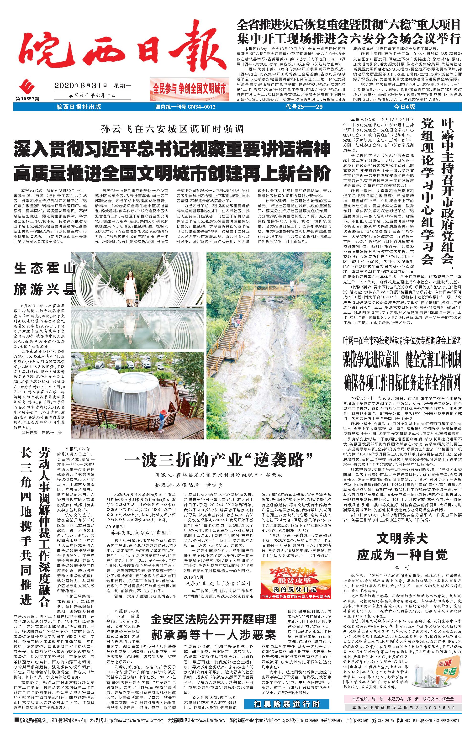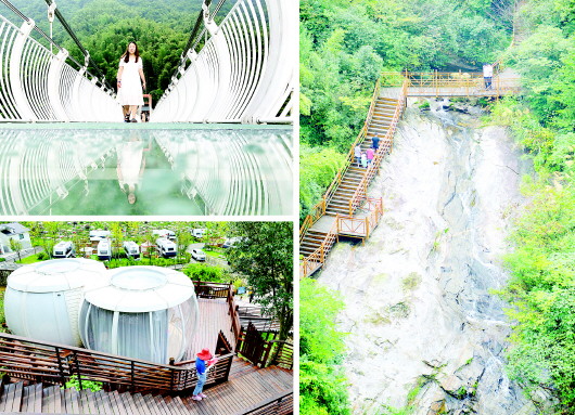 8月26日,游人在霍山县落儿岭镇境内的大峡谷景区玻璃吊桥观光、游玩。位于大别山腹地的霍山县全年空气质量优良率达98%以上,平均每立方厘米空气负氧离子含量约4200个,被誉为中国天然氧吧,荣获中西部首个生态县、全国养生宜居县。 近年来该县坚持“既要金山银山、又要绿水青山”的发展理念,借助大别山国家风景道,依托生态资源优势,不断完善基础设施,将全县旅游资源完美串联,推进打造大别山(霍山)最美旅游环线,以旅兴县,助力乡村振兴。左上图:8月26日,游人在霍山县落儿岭镇境内的大峡谷景区玻璃吊桥观光、游玩。左下图:位于霍山县太阳乡境内的大别山房车营地备受广大游客青睐。右图:霍山县落儿岭镇境内景区观光步道成为游客休闲赏景的好去处。 本报记者 田凯平 摄