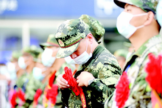 9月16日,我市在六安火车站举行2020年度新兵首运仪式。首批400余名新战士经过严格的体检、政审、役前集中集训,并根据疫情防控要求进行核酸检测合格后,披红戴花、身着戎装,在激昂的军歌声中,满载着亲人和军地领导的祝福和嘱托,挥别家乡踏上卫国戍边的军旅新征程。据了解,2020年征兵工作拉开后,我市一大批品学兼优的优秀青年踊跃报名自觉接受祖国挑选,其中大学生新兵比例达到98.8%以上、大学毕业生比例达到24.8%,兵种涵盖陆军、海军陆战队、武警等。 图为一名新兵整理行装准备出发。 本报记者 田凯平 摄
