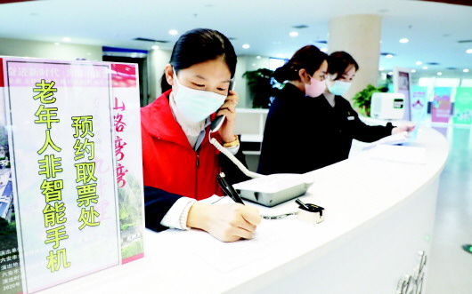 日前, 国务院办公厅《关于切实解决老年人运用智能技术困难的实施方案》发布。为更好地服务本地老年观众的需求,近日,市文化馆在大力丰富群众性文化活动的同时,推出“非智能手机预约票务”热线服务,不会使用网络订票的老年人,可通过热线电话方式订票,统一进行登记、核对、出票,同时设置无码观众信息登记服务处,多渠道方便群众。 图为11月27日,市文化馆志愿者接听市民预订黄梅戏《山路弯弯九十里》的戏票。 本报记者 邱杨/文 王丽/图