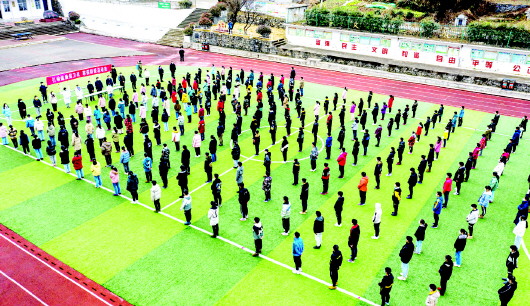 1月21日,放假前一天,金寨县关庙实验学校283名学生在教学楼前参加寒假疫情防控动员会。