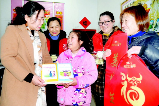 1月31日,六安经济技术开发区妇联工作人员将科普书籍和新年礼包送到辖区新井村留守儿童、市人民路小学北校区三年级李芷涵同学的家中。当日,六安经济技术开发区妇联以“线上开讲座+线下送关爱”的形式为留守儿童进行家风家教宣讲、开展法治安全讲座、走访留守儿童,鼓励和帮助他们解决心理和生活中遇到的难题,让他们感受来自社会大家庭的别样温暖,度过一个健康、安全、温暖、幸福、爱意融融的寒假。 本报记者 田凯平 摄