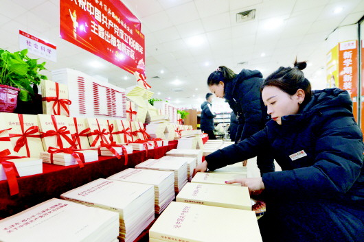 3月6日,在六安城区新华书店“奋斗百年路 启航新征程”庆祝中国共产党成立100周年主题出版物展示区,工作人员在整理新收到的党史党建书籍。