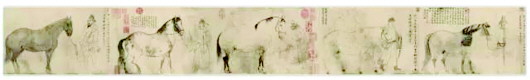 《五马图》无名款,现藏于日本东京国立博物馆。《五马图》以白描的手法画了五匹西域进贡给北宋朝廷的骏马,各由一名奚官牵引。每匹马后有宋黄庭坚题字,谓马之年龄、进贡时间、马名、收于何厩等,并跋称为李伯时(公麟)所作。 五匹马各具美名,令人遐想。依次为:凤头骢、锦膊骢、好头赤、照夜白、满川花。而五位奚官则前三人为西域装束,后两人为汉人。每匹马前面均有一耷马人。此画中的马及牵马人,均是画家根据真实对象写生创作的。前三位控马者为西域少数民族的形象和装束,姿态各异,无一雷同,其精神气质亦微有差异,有饱经风霜、谨小慎微者;有年轻气盛、执缰阔步者;有身穿宫服、气度骄横者。五匹毛色状貌各不相同的马。或静止,或缓步徐行,比例准确,神完气足。 画家用纯熟的白描技法,把盛行于唐代吴道子时代的“白画”发展为具有丰富表现力的画种——白描,这幅画就是确立这一画种的标志。在白描的基础上微施淡墨渲染,辅佐了线描的表现力,使艺术效果更为完善,体现了文人画注重简约、儒雅和淡泊的审美观。自此之后,几乎所有的白描人马画无不源出于李公麟的白描艺术。李公麟以其“行云流水”般的线条,飘逸而行止如意,虽只是白描勾画,却非常具有质感。观看马的轮廓,似乎能感觉得到其骨骼肌肉,略加烘染后,又似乎能感觉到其皮毛、斑纹。人物的面部刻画很简单,但结构异常准确,状貌极其生动,须眉之间,不但可视其年龄、身份、民族,甚至从表情可以窥其内心。 (综合舒城先锋网、腾讯网报道)