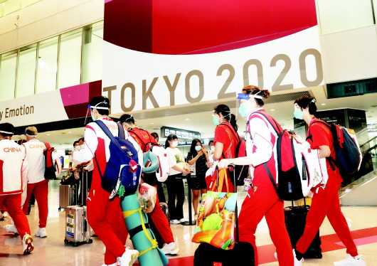 7月19日,中国体育代表团成员抵达东京成田机场。