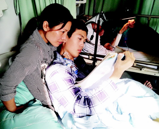 病榻上的周桐依靠着妈妈,依然如饥似渴地学习着。
