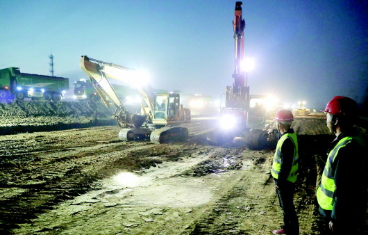夜晚的舒城县桃溪圈圩,阵阵轰鸣声划破黑夜的宁静,杭埠河治理工程施工工地灯火通明,挖掘机往来穿梭,工人们各司其职,一派火热的建设场景。 据了解,杭埠河治理工程是按照水利部、国家发改委、财政部《加快灾后水利薄弱环节建设实施方案》等政策要求实施的流域面积3000平方公里以上中小河流治理项目。工程涉及合肥市肥西县,六安市金安区、舒城县,其中六安市概算投资175766万元。本报记者 王丽 摄