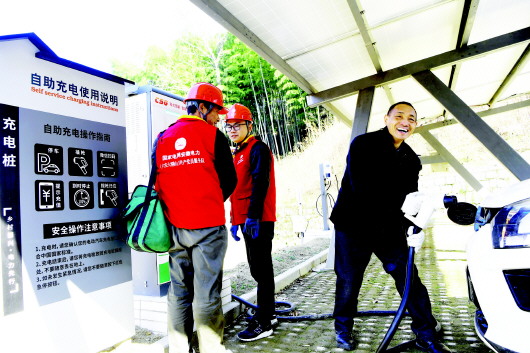 2021年12月29日,金寨县花石乡大湾村村民吴善喜(右一)在村光伏、充电一体化5G智能充电站为电动汽车充电。