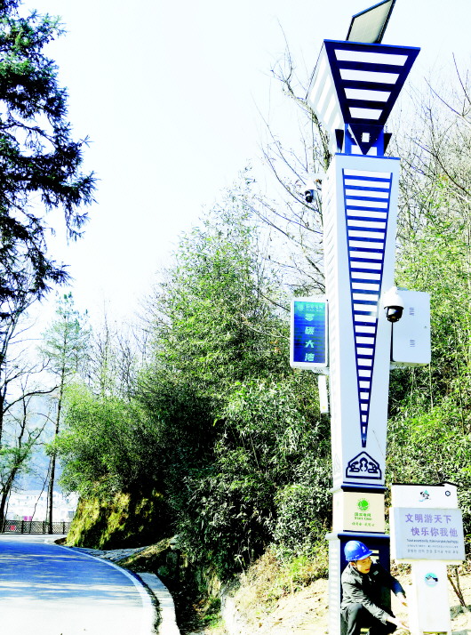 大湾村电力驿站的工人在检修村里的光伏智慧路灯。光伏智慧路灯实现太阳能发电、储能、安防监控、信息发布、应急广播、环境监测、智能管理等多功能于一体,有效降低公共设施能耗。