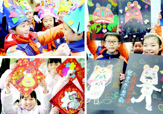 1月13日,金安区人民路小学东校开展“做灯笼、绘‘福’字、捏泥塑、庆新春、迎冬奥”主题活动,同学们在老师的带领下利用废旧物品赶制形状各异的灯笼、虎头帽,绘画“福”字、创作北京冬奥会主题儿童画等,喜迎新春佳节,助威北京冬奥会。 左上图:同学们在相互佩戴自己制作充满童趣及新奇感的虎头帽,传达虎年祝福。左下图:同学们展示绘画的“福”字,祝福虎年春节。右图:一幅幅“虎虎生威——北京冬奥会”主题儿童画,助威北京冬奥会。 本报记者 田凯平 通讯员 刘长明 摄