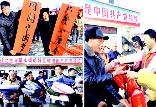 右图:党员志愿者为龙井村村民送上新春礼包。