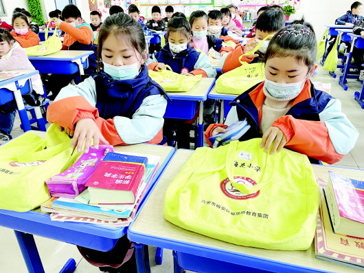 3月24日,裕安区梅花小学的学生们将小文具放进自己的“收纳袋”。 新学期,梅花小学的学生们都收到学校统一发放的黄色“收纳袋”,每个收纳袋上面可以写上姓名、班级。平时有美术课、体育课或者一些手工活动课时,同学们将需要的水彩笔、橡皮泥等文具和小的体育器材放入袋子内。这样既方便学生拿、放,也可以养成收纳的好习惯。“收纳袋”统一挂在课桌边的挂钩上,减少了因书包杂乱摆放,导致学生摔跤、磕碰的安全隐患。 朱成红 本报记者 张玉 文/图