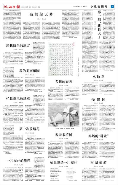 在一棵又高又粗的大树上,冒出了一颗颗音符般的小嫩芽。因为那时是温暖的春天。它们经过春雨的滋润和阳光的照耀,长成了绿油油的叶子,颜色十分新鲜。 在这些叶子中,有一片树叶,它觉得每天待在这里过着同样的生活有些无聊。于是它趁着一阵大风吹过的时候,成功挣脱了大树,在天空中快乐地飘荡着。它飞过树林,飞过草原,飞过田野,落到一条小河上。这时,正好有一群小蚂蚁要过河,那片树叶说:“你们快到我的背上来,我驮着你们过去。”于是小蚂蚁们爬到树叶上面,树叶驮着小蚂蚁安全地过了河,它们开心地对叶子说:“谢谢你的帮助,小树叶!” 这片树叶一直在小河里帮小昆虫们过河,可是它碧绿的外衣已经换成了火红的裙子,它想:啊!秋天来了,我应该让人们知道秋天来了。正好有一阵秋风吹过,它飘到了森林里,狗熊看见了它就去找食物,小鸟看见了它也去寻找过冬的粮食……不一会儿,森林里大大小小的动物都知道了秋天到来的消息。 转眼间冬天到了,在一个鸟巢里,有一只鸟冷得直打哆索,树叶飘到了小鸟身上,小鸟感觉很温暖,于是睡着了。 这片叶子的旅程到这里就结束了,它感到很幸福、很温暖! 指导老师 周其艳