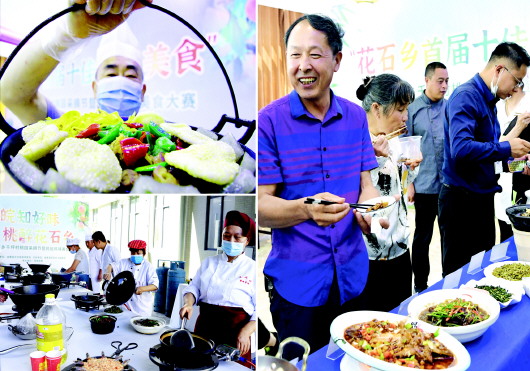 6月17日,金寨县花石乡风味美食大赛在大湾村举行,来自大湾、千坪、花石等村30多家农家乐的“大厨”利用农家自养的鸡、鸭、鹅和山野菜等食材,现场烹制出40多道大别山区特色风味美食参加比赛。 近年来,金寨县花石乡大湾村乡村旅游热带动了农家乐、乡村民宿蓬勃发展,通过举办风味美食比赛,帮助农家乐经营者进一步丰富美食品种,提升烹制技艺,打造山区特色美食村,让游客尽享山村特色美食带来的乐趣。 左上图:6月17日,金寨县花石乡大湾村老屋民宿经营者漆威在展示自己参赛的吊锅宴菜品。 左下图:参加风味美食大赛的农家乐经营者在烹制菜肴。 右图:金寨县花石乡大湾村的村民和游客一起在品尝参赛菜品。 本报记者 陈力 杨秀玲 通讯员 闫明星 摄