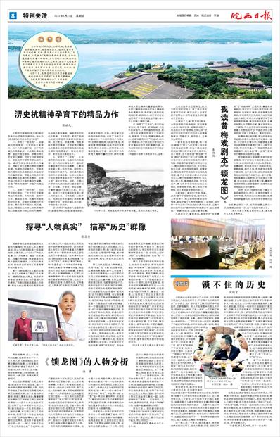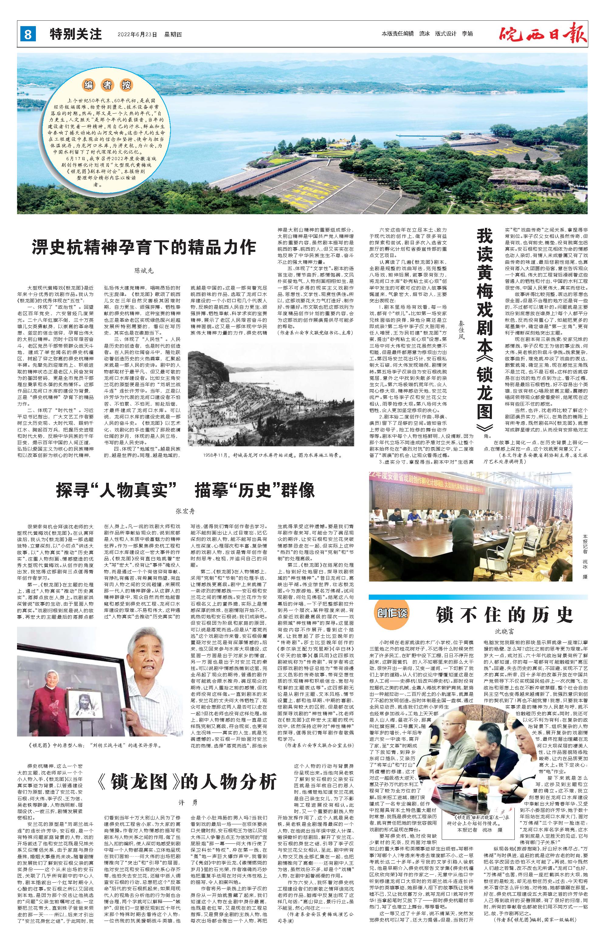 淠史杭精神,这么一个宏大的主题,沈老师却从一个个小人物入手,《锁龙图》以当年真实事迹为背景,以普通建设者们为原型,塑造了安兰花、安石根、何大伟、李子汉、王为信、吴老铁等群像,人物线明晰、层层设伏、一波三折,剧情发展紧密相扣。 安兰花的原型是“刘胡兰战斗连”的连长许芳华;安石根,是一个有特殊问题家庭背景的人物,戏的开场叙述了他和安兰花既是兄妹关系又似情侣关系,由于家庭与身份悬殊,婚姻大事悬而未决。随着剧情的发展我们了解到安石根父亲的真实身份——这个从未出场的安石匠,关联了几乎所有剧中的中心人物,剧本插叙出一个红军时期令人心酸的往事。安石根之所以又回流到本地,是因为那个没法让他挑选的“问题”父亲生前嘱咐过他:一定要把兰花带大,直到妹子爸爸来领走的那一天……所以,后来才引出了“安兰花身世之谜”,于此同时,我们看到当年十万大别山人民为了修建淠史杭工程舍小家、为大家的高尚情操。作者对人物情感的描写和剧本与人物关系之间的作用,做了丝丝入扣的编织,使人深切地感受到剧中每一个人物都是真实、立体地呈现在我们面前……何大伟的出场把剧情推向了“突出”和“引导”的层面,他对安兰花和安石根的关系心存芥蒂,他怕失去安兰花,还暗中派人调查安石根的行动,总想把这个“反革命”后代的安石根抓起来;如果用现代人的视角去分析他的行为倒也合情合理,两个字就可以解释——“嫉妒”,但我们一定要反观到五十年代末那个特殊时期去看待这个人物:一位伤残的抗美援朝战斗英雄,他会是个小肚鸡肠的男人吗?当我们看到戏的最后一场——在坝体要决口关键时刻,安石根和王为信以及何大伟三人争着去点王为信发明的“歪屁股炮”那一幕——何大伟行使了保卫科长“特权”,冲在第一线,在“轰”地一声巨大爆炸声中,我看到了《亮剑》中的李云龙,《激情燃烧的岁月》里的石光荣,作者准确而巧妙地把重复手法用在对何大伟性格上的描写,令人拍案叫绝。 作者将另一条线上的李子汉的身份从一开始就雪藏了起来,我们知道这个人物在全剧中身份最高,他既是老红军,又是现在的工程总指挥,又是贯穿全剧的主线人物,他每次出场都会推出一个人物,再把这个人物的行动与背景身份呈现出来。当他向吴老铁了解到安石根的父亲安石匠就是当年救自己的恩人时,他清楚地知道安兰花就是自己亲生女儿,为了不影响工程进展没有相认。此时,又一个重要的副线人物开始发挥作用了,这个人就是吴老铁,吴老铁是全剧埋得最深的一个人物,在他说出当年误中敌人计谋、错误锄奸的悲剧后,解开了安兰花、安石根的身世之谜,引导了李子汉与安兰花父女相认,至此,剧中所有人物交叉线全部汇集在一起,也把剧情推向了高潮……还有剧中人王为信,虽然戏份不多,却是个“戏精”人物,在剧中起着润滑的作用。 作为六安人,我怀着对淠史杭工程建设者们的崇敬之情拜读完沈老师的作品,脑海中反复出现了这样几句话:“高山仰止,景行行止。虽不能至,然心向往之…… (作者系金安区黄梅戏演艺公司导演)