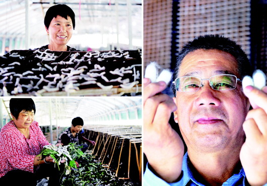 金寨县利用山区资源优势,采取资金扶持、技术引导、项目延伸等措施发展蚕桑产业,构建制种、饲养和丝绸制品开发全过程产业链,建成桑园2.6万亩、发展桑蚕丝绸市场主体200余家,让传统产业焕发生机,成为山区乡村振兴的特色产业,带动集体经济和群众稳定增收。 1:金寨县铁冲乡张店村村民陆宏荣正在将老蚕上蔟。(左上) 2:蚕农正在分拣熟蚕。(左下) 3:金寨县天丰桑蚕原种场有限公司高级农艺师宋承国在观察蚕儿营茧情况。(右) 本报记者 陈力 宋金婷 图/文