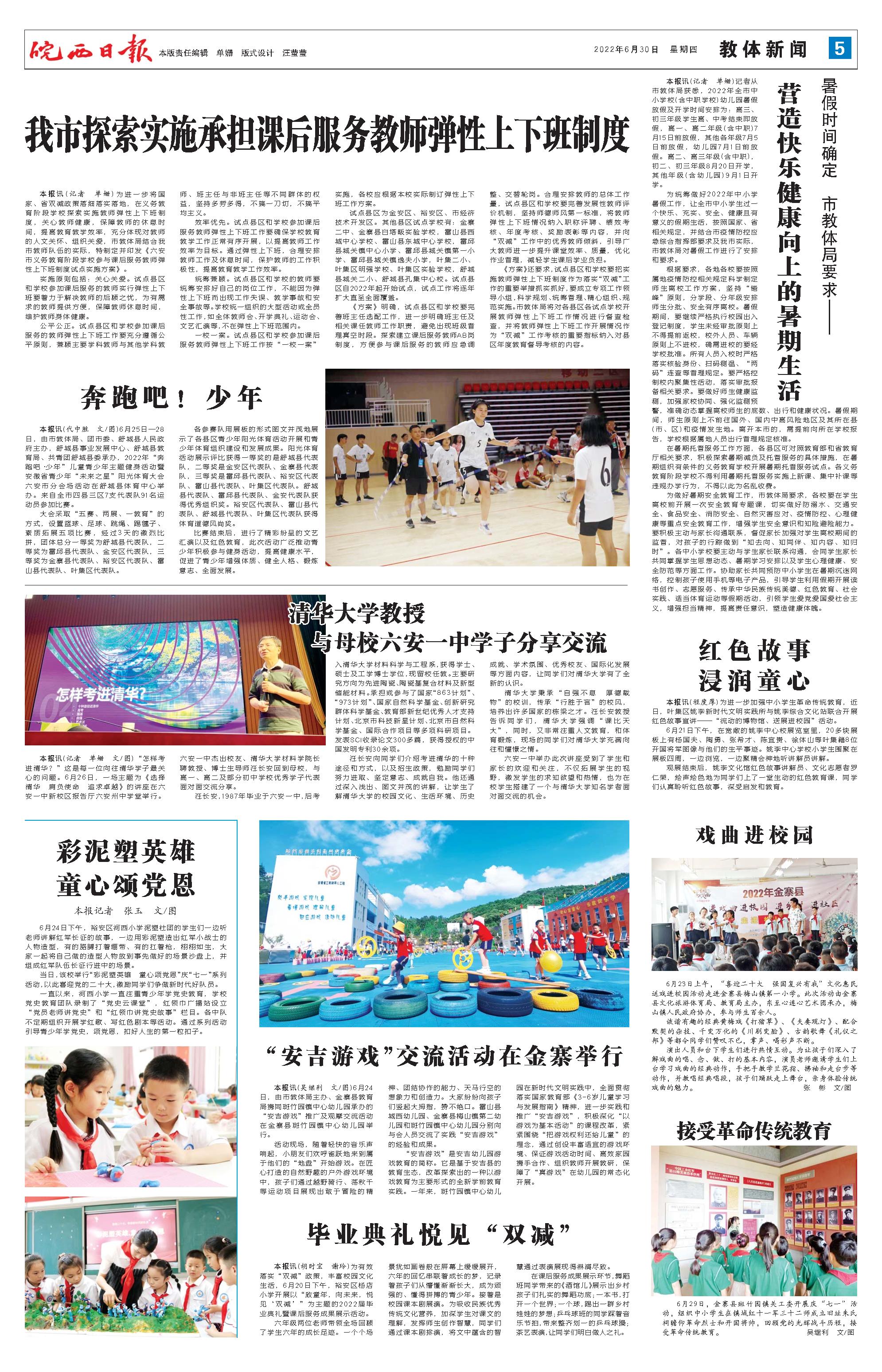 本报讯(记者 单姗)为进一步将国家、省双减政策落细落实落地,在义务教育阶段学校探索实施教师弹性上下班制度,关心教师健康,保障教师的休息时间,提高教育教学效率,充分体现对教师的人文关怀、组织关爱,市教体局结合我市教师队伍的实际,特制定并印发《六安市义务教育阶段学校参与课后服务教师弹性上下班制度试点实施方案》。 实施原则包括:关心关爱。试点县区和学校参加课后服务的教师实行弹性上下班要着力于解决教师的后顾之忧,为有需求的教师提供方便,保障教师休息时间,维护教师身体健康。 公平公正。试点县区和学校参加课后服务的教师弹性上下班工作要充分遵循公平原则,兼顾主要学科教师与其他学科教师、班主任与非班主任等不同群体的权益,坚持多劳多得,不搞一刀切,不搞平均主义。 效率优先。试点县区和学校参加课后服务教师弹性上下班工作要确保学校教育教学工作正常有序开展,以提高教师工作效率为目标。通过弹性上下班,合理安排教师工作及休息时间,保护教师的工作积极性,提高教育教学工作效率。 统筹兼顾。试点县区和学校的教师要统筹安排好自己的岗位工作,不能因为弹性上下班而出现工作失误、教学事故和安全事故等。学校统一组织的大型活动或全员性工作,如全体教师会、开学典礼、运动会、文艺汇演等,不在弹性上下班范围内。 一校一案。试点县区和学校参加课后服务教师弹性上下班工作按“一校一案”实施,各校应根据本校实际制订弹性上下班工作方案。 试点县区为金安区、裕安区、市经济技术开发区。其他县区试点学校有:金寨二中、金寨县白塔畈实验学校,霍山县西城中心学校、霍山县东城中心学校,霍邱县城关镇中心小学、霍邱县城关镇第一小学、霍邱县城关镇逸夫小学,叶集二小、叶集区明强学校、叶集区实验学校,舒城县城关二小、舒城县孔集中心校。试点县区自2022年起开始试点,试点工作将逐年扩大直至全面覆盖。 《方案》明确,试点县区和学校要完善班主任选配工作,进一步明确班主任及相关课任教师工作职责,避免出现班级管理真空时段。探索建立课后服务教师AB岗制度,方便参与课后服务的教师应急调整、交替轮岗。合理安排教师的总体工作量,试点县区和学校要完善发展性教师评价机制,坚持师德师风第一标准,将教师弹性上下班情况纳入职称评聘、绩效考核、年度考核、奖励表彰等内容,并向“双减”工作中的优秀教师倾斜,引导广大教师进一步提升课堂效率、质量,优化作业管理,减轻学生课后学业负担。 《方案》还要求,试点县区和学校要把实施教师弹性上下班制度作为落实“双减”工作的重要举措抓实抓好,要成立专项工作领导小组,科学规划、统筹管理、精心组织、规范实施。市教体局将对各县区各试点学校开展教师弹性上下班工作情况进行督查检查,并将教师弹性上下班工作开展情况作为“双减”工作考核的重要指标纳入对县区年度教育督导考核的内容。