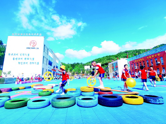 本报讯(吴继利 文/图)6月24日,由市教体局主办、金寨县教育局携同斑竹园镇中心幼儿园承办的“安吉游戏”推广及观摩交流活动在金寨县斑竹园镇中心幼儿园举行。 活动现场,随着轻快的音乐声响起,小朋友们欢呼雀跃地来到属于他们的“地盘”开始游戏。在匠心打造的自然野趣的户外游戏环境中,孩子们通过越野骑行、荡秋千等运动项目展现出敢于冒险的精神、团结协作的能力、天马行空的想象力和创造力。大家纷纷向孩子们竖起大拇指,赞不绝口。霍山县城西幼儿园、金寨县梅山镇第二幼儿园和斑竹园镇中心幼儿园分别向与会人员交流了实践“安吉游戏”的经验和成果。 “安吉游戏”是安吉幼儿园游戏教育的简称。它是基于安吉县的教育生态,改革探索出的一种以游戏教育为主要形式的全新学前教育实践。一年来,斑竹园镇中心幼儿园在新时代文明实践中,全面贯彻落实国家教育部《3-6岁儿童学习与发展指南》精神,进一步实践和推广“安吉游戏”,积极深化“以游戏为基本活动”的课程改革,紧紧围绕“把游戏权利还给儿童”的理念,通过创设丰富适宜的游戏环境、保证游戏活动时间、高效家园携手合作、组织教师开展教研,保障了“真游戏”在幼儿园的常态化开展。