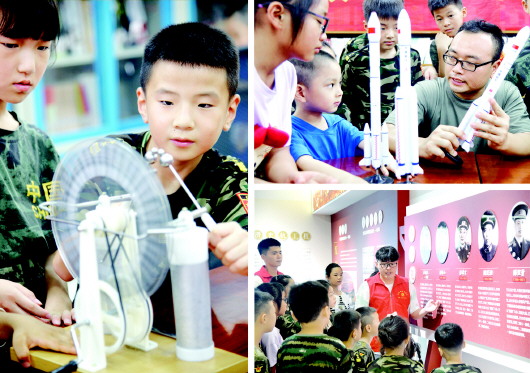 7月23日,叶集区姚李镇乡村“复兴少年宫”,参加暑期夏令营的小朋友们在体验科普展品(左图),乐享智能科技魅力。为丰富中小学生在“双减”政策落地后的首个暑假生活,叶集区姚李镇乡村“复兴少年宫”依托镇综合文化站,积极统筹就近的公共文化服务单位、招募大学生志愿者、年轻退役军人等,通过举办“橄榄绿”暑期夏令营、“桃李”暑期公益培训班等形式,为乡村中小学生开展社会实践、安全常识、音乐舞蹈、美术体育和传统教育等课程服务,助力学校教育、家庭教育和社会教育的有机衔接,让青少年学生在更加多元的实践作业中收获快乐和新知,点亮多彩梦想,度过一个别样的暑假生活。 右上图:军事教官在为小朋友们讲解航天科普知识。 右下图:家住姚李镇就读于合肥学院的大学生许光宇在为青少年学生介绍革命传统故事,厚植爱国情怀。 本报记者 田凯平 通讯员 汤贤才 摄