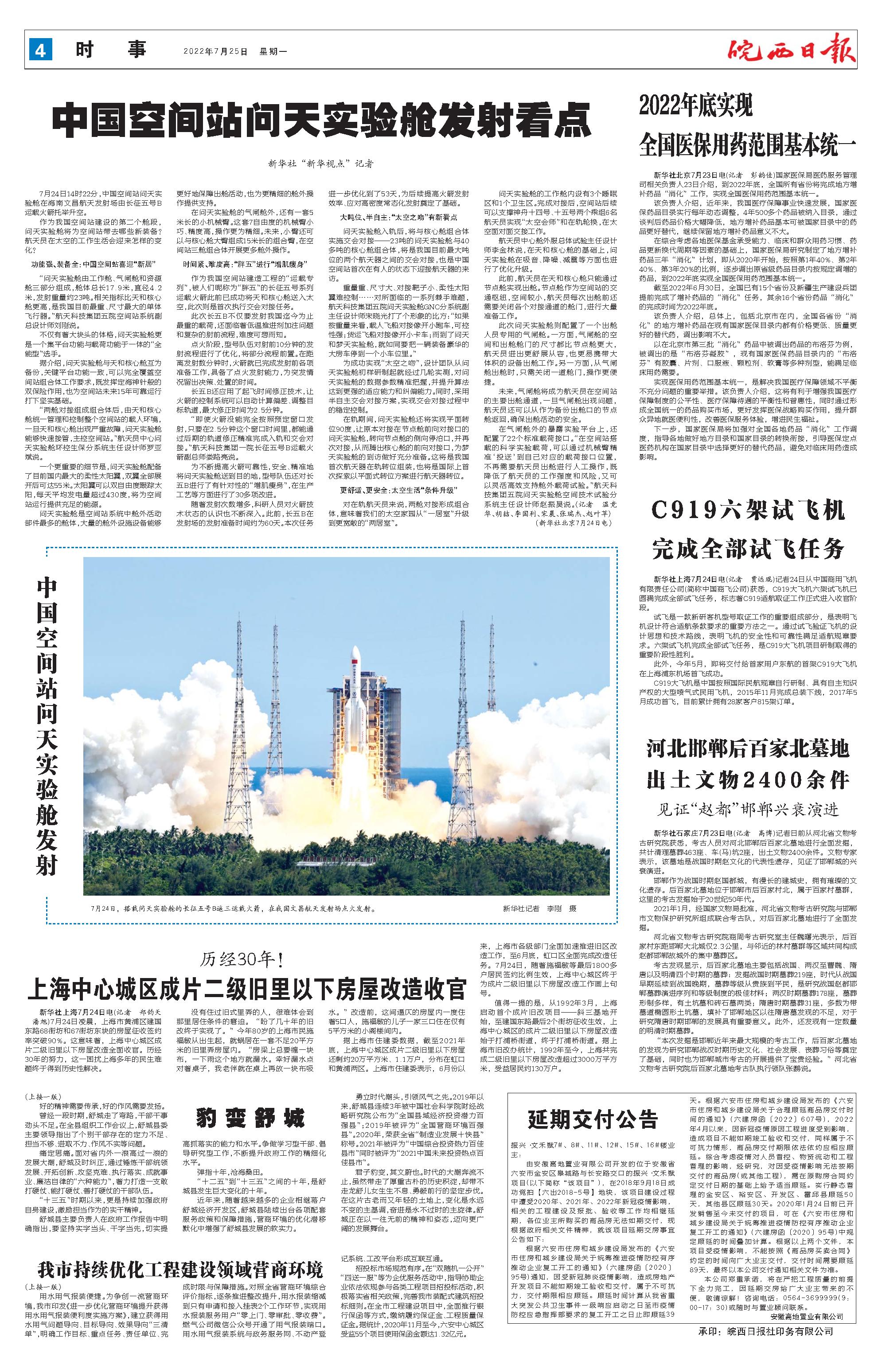 7月24日14时22分,中国空间站问天实验舱在海南文昌航天发射场由长征五号B运载火箭托举升空。 作为我国空间站建设的第二个舱段,问天实验舱将为空间站带去哪些新装备?航天员在太空的工作生活会迎来怎样的变化? 功能强、装备全:中国空间站喜迎“新居” “问天实验舱由工作舱、气闸舱和资源舱三部分组成,舱体总长17.9米,直径4.2米,发射重量约23吨。相关指标比天和核心舱更高,是我国目前最重、尺寸最大的单体飞行器。”航天科技集团五院空间站系统副总设计师刘刚说。 不仅有着大块头的体格,问天实验舱更是一个集平台功能与载荷功能于一体的“全能型”选手。 据介绍,问天实验舱与天和核心舱互为备份,关键平台功能一致,可以完全覆盖空间站组合体工作要求,既发挥定海神针般的双保险作用,也为空间站未来15年可靠运行打下坚实基础。 “两舱对接组成组合体后,由天和核心舱统一管理和控制整个空间站的载人环境,一旦天和核心舱出现严重故障,问天实验舱能够快速接管,主控空间站。”航天员中心问天实验舱环控生保分系统主任设计师罗亚斌说。 一个更重要的细节是,问天实验舱配备了目前国内最大的柔性太阳翼,双翼全部展开后可达55米。太阳翼可以双自由度跟踪太阳,每天平均发电量超过430度,将为空间站运行提供充足的能源。 问天实验舱是空间站系统中舱外活动部件最多的舱体,大量的舱外设施设备能够更好地保障出舱活动,也为更精细的舱外操作提供支持。 在问天实验舱的气闸舱外,还有一套5米长的小机械臂。这套7自由度的机械臂小巧、精度高,操作更为精细。未来,小臂还可以与核心舱大臂组成15米长的组合臂,在空间站三舱组合体开展更多舱外操作。 时间紧、难度高:“胖五”进行“增肌瘦身” 作为我国空间站建造工程的“运载专列”,被人们昵称为“胖五”的长征五号系列运载火箭此前已成功将天和核心舱送入太空,此次则是首次执行交会对接任务。 此次长五B不仅要发射我国迄今为止最重的载荷,还面临着低温推进剂加注问题和复杂的射前流程,难度可想而知。 点火阶段,型号队伍对射前10分钟的发射流程进行了优化,将部分流程前置。在距离发射数分钟时,火箭就已完成发射前各项准备工作,具备了点火发射能力,为突发情况留出决策、处置的时间。 长五B还应用了起飞时间修正技术,让火箭的控制系统可以自动计算偏差、调整目标轨道,最大修正时间为2.5分钟。 “即使火箭没能完全按照预定窗口发射,只要在2.5分钟这个窗口时间里,都能通过后期的轨道修正精准完成入轨和交会对接。”航天科技集团一院长征五号B运载火箭副总师娄路亮说。 为不断提高火箭可靠性,安全、精准地将问天实验舱送到目的地,型号队伍还对长五B进行了有针对性的“增肌瘦身”,在生产工艺等方面进行了30多项改进。 随着发射次数增多,科研人员对火箭技术状态的认识也不断深入。此前,长五B在发射场的发射准备时间约为60天。本次任务进一步优化到了53天,为后续提高火箭发射效率、应对高密度常态化发射奠定了基础。 大吨位、半自主:“太空之吻”有新看点 问天实验舱入轨后,将与核心舱组合体实施交会对接——23吨的问天实验舱与40多吨的核心舱组合体,将是我国目前最大吨位的两个航天器之间的交会对接,也是中国空间站首次在有人的状态下迎接航天器的来访。 重量重、尺寸大、对接靶子小、柔性太阳翼难控制……对所面临的一系列棘手难题,航天科技集团五院问天实验舱GNC分系统副主任设计师宋晓光打了个形象的比方:“如果按重量来看,载人飞船对接像开小跑车,可控性强;货运飞船对接像开小卡车;而到了问天和梦天实验舱,就如同要把一辆装备豪华的大房车停到一个小车位里。” 为成功实现“太空之吻”,设计团队从问天实验舱初样研制起就经过几轮实测,对问天实验舱的数据参数精准把握,并提升算法达到更强的适应能力和纠偏能力。同时,采用半自主交会对接方案,实现交会对接过程中的稳定控制。 在轨期间,问天实验舱还将实现平面转位90度,让原本对接在节点舱前向对接口的问天实验舱,转向节点舱的侧向停泊口,并再次对接,从而腾出核心舱的前向对接口,为梦天实验舱的到访做好充分准备。这将是我国首次航天器在轨转位组装,也将是国际上首次探索以平面式转位方案进行航天器转位。 更舒适、更安全:太空生活“条件升级” 对在轨航天员来说,两舱对接形成组合体,意味着我们的太空家园从“一居室”升级到更宽敞的“两居室”。 问天实验舱的工作舱内设有3个睡眠区和1个卫生区。完成对接后,空间站后续可以支撑神舟十四号、十五号两个乘组6名航天员实现“太空会师”和在轨轮换,在太空面对面交接工作。 航天员中心舱外服总体试验主任设计师李金林说,在天和核心舱的基础上,问天实验舱在吸音、降噪、减震等方面也进行了优化升级。 此前,航天员在天和核心舱只能通过节点舱实现出舱。节点舱作为空间站的交通枢纽,空间较小,航天员每次出舱前还需要关闭各个对接通道的舱门,进行大量准备工作。 此次问天实验舱则配置了一个出舱人员专用的气闸舱。一方面,气闸舱的空间和出舱舱门的尺寸都比节点舱更大,航天员进出更舒展从容,也更易携带大体积的设备出舱工作。另一方面,从气闸舱出舱时,只需关