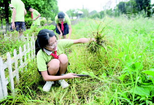8月31日,嘉兴市新丰镇中心小学学生在校园农场除草。