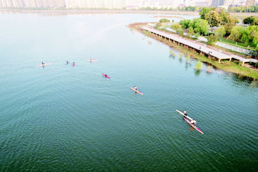 10月29日,六安市皮划艇运动员正在淠河月亮岛水域训练。(无人机照片)