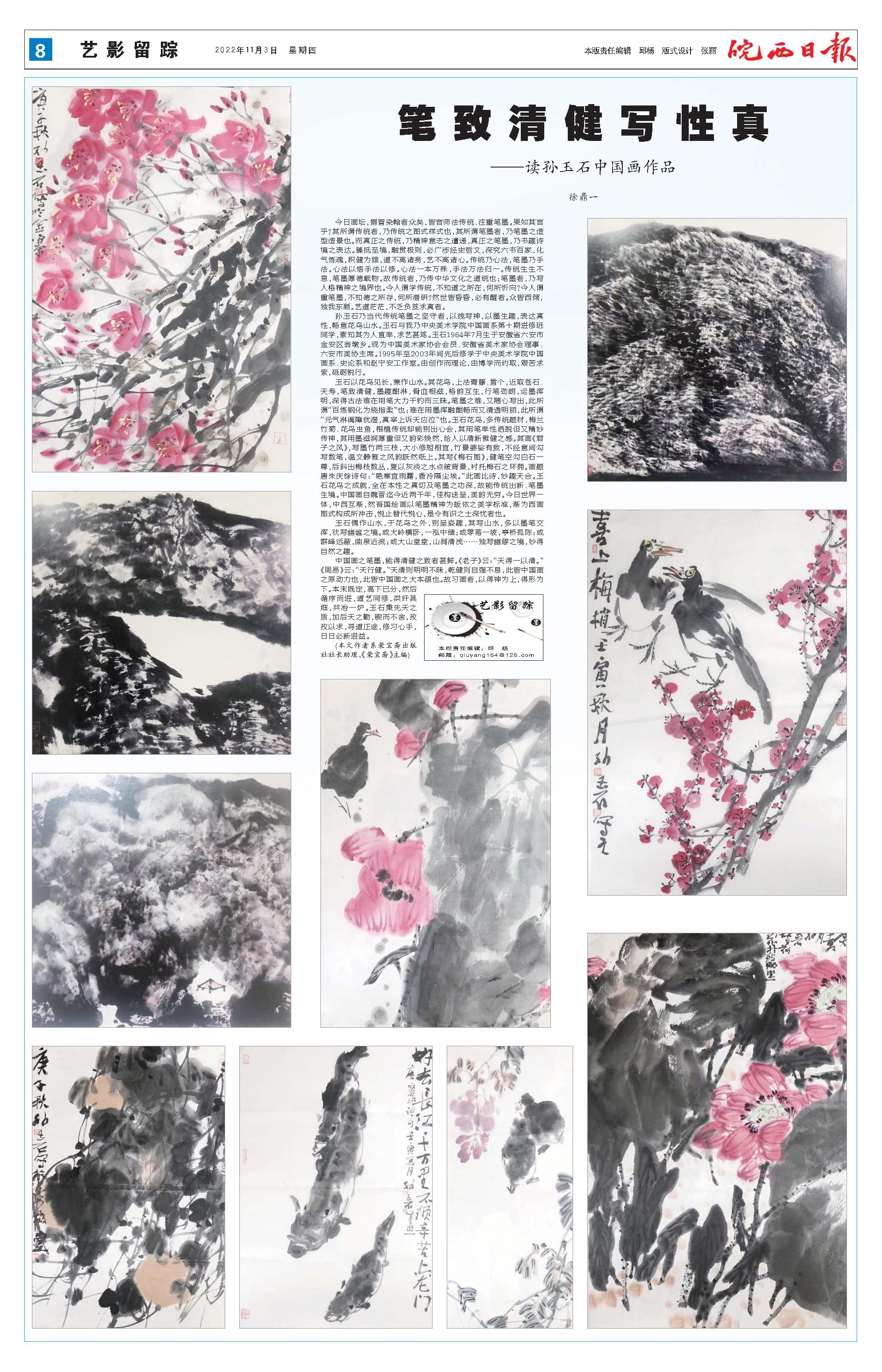 今日画坛,搦管染翰者众矣,皆言师法传统、注重笔墨。果如其言乎?其所谓传统者,乃传统之图式样式也,其所谓笔墨者,乃笔墨之造型造景也。而真正之传统,乃精神意志之邅递,真正之笔墨,乃书趣诗境之表达。臻抵至境,融贯极则,必广涉经史哲文,深究六书百家,化气炼魂,积健为雄,道不离诸身,艺不离诸心。传统乃心法,笔墨乃手法。心法以悟手法以修。心法一本万殊,手法万法归一。传统生生不息,笔墨厚德载物。故传统者,乃传中华文化之道统也;笔墨者,乃写人格精神之境界也。今人谓学传统,不知道之所在,何所忻向?今人谓重笔墨,不知德之所存,何所潜研?然世皆昏昏,必有醒者。众皆西倾,独我东顾。艺道茫茫,不乏负笈求真者。 孙玉石乃当代传统笔墨之坚守者,以线写神,以墨生趣,表达真性,畅意花鸟山水。玉石与我乃中央美术学院中国画系第十期进修班同学,素知其为人直率,求艺甚笃。玉石1964年7月生于安徽省六安市金安区翁墩乡。现为中国美术家协会会员、安徽省美术家协会理事、六安市美协主席。1995年至2003年间先后修学于中央美术学院中国画系、史论系和赵宁安工作室。由创作而理论,由博学而约取,艰苦求索,砥砺锐行。 玉石以花鸟见长,兼作山水。其花鸟,上法青藤、雪个,近取苍石、天寿,笔致清健,墨趣酣淋,骨血相滋,格韵互生,行笔劲朗,运墨浑明,深得古法难在用笔大力千钓而三昧。笔墨之难,又随心写出,此所谓“百炼钢化为绕指柔”也;难在用墨浑融酣畅而又清透明丽,此所谓“元气淋漓障犹湿,真宰上诉天应泣”也。玉石花鸟,多传统题材,梅兰竹菊、花鸟虫鱼,根植传统却能别出心会,其用笔率性洒脱但又精妙传神,其用墨滋润厚重但又韵彩焕然,给人以清新雅健之感。其画《君子之风》,写墨竹两三枝,大小修短相宜,竹景婆娑有致,不经意间勾写数笔,温文静雅之风韵跃然纸上。其写《梅石图》,健笔空勾白石一尊,后斜出梅枝数丛,复以灰淡之水点皴背景,衬托梅石之环拥。画题唐朱庆馀诗句:“艳寒宜雨露,香冷隔尘埃。”此画比诗,妙趣天合。玉石花鸟之成就,全在本性之真切及笔墨之功深,故能传统出新、笔墨生境。中国画自魏晋迄今近两千年,佳构迭呈,美韵无穷。今日世界一体,中西互渐,然吾国绘画以笔墨精神为皈依之美学标准,渐为西画图式构成所冲击,悦止替代悦心,是令有识之士深忧者也。 玉石偶作山水,于花鸟之外,别呈姿趣,其写山水,多以墨笔交浑,状写幽谧之境。或大岭横卧,一泓中储;或零落一坡,亭桥孤陈;或群峰远蔽,曲泉近流;或大山堂堂,山涧清浅……独写幽僻之境,妙得自然之趣。 中国画之笔墨,能得清健之致者甚鲜。《老子》云:“天得一以清。”《周易》云:“天行健。”天清则明明不昧,乾健则自强不息,此皆中国画之原动力也,此皆中国画之大本源也。故习画者,以得神为上,得形为下。本末既定,高下已分,然后循序而进,道艺同修,洪纤具细,共冶一炉。玉石秉先天之质,加后天之勤,锲而不舍,孜孜以求,寻道正途,修习心手,日日必新进益。 (本文作者系荣宝斋出版社社长助理、《荣宝斋》主编)