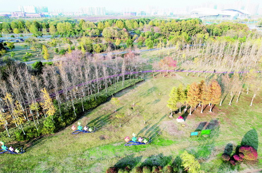 初冬时节,市民在冬景如画的淠河国家湿地公园露营游玩。