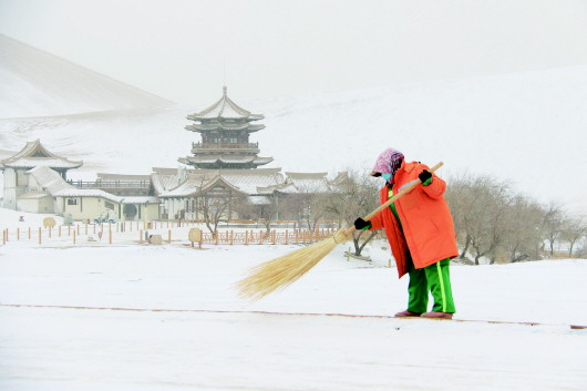 11月28日,保洁人员在甘肃省敦煌市鸣沙山月牙泉景区清理积雪。