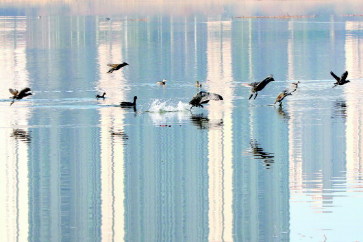 近日,城区老淠河月亮岛段,一群野鸭和水鸟时而飞舞,时而在浅水边觅食栖息,与暖阳下的老淠河形成一幅美丽图画。近年来,我市不断加强对城区新老淠河的持续治理和保护,使淠河国家水利风景区的生态环境得到有效改善,每年栖息在两河城区段的野生鸟类数量逐年增加,市民在家门口就能享受到大自然的和谐之美。 本报记者 田凯平 摄