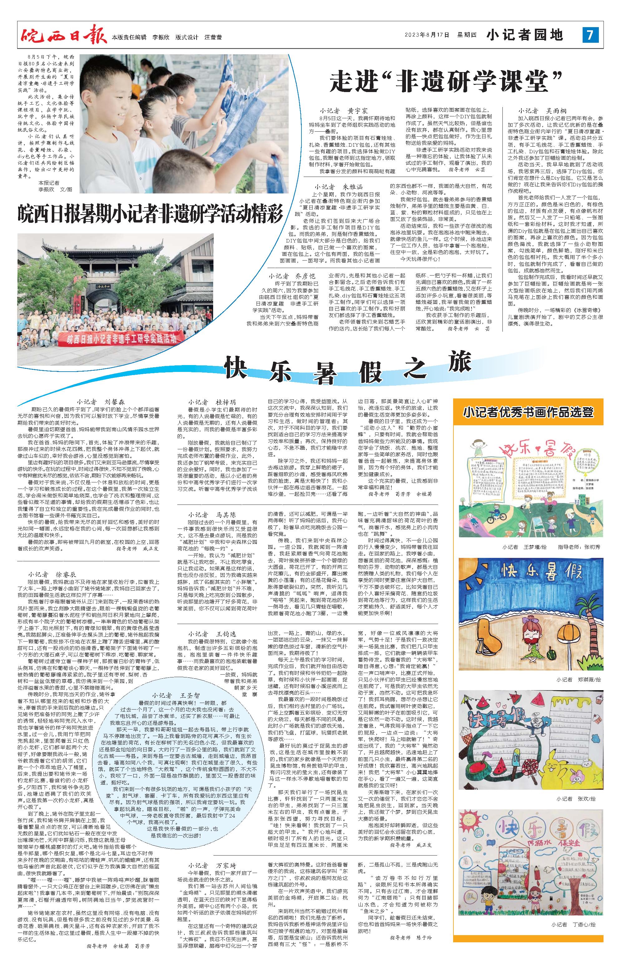 小记者 刘馨淼 期盼己久的暑假终于到了,同学们的脸上个个都洋溢着无尽的喜悦和兴奋,因为我们可以暂时放下学业,尽情享受暑期给我们带来的美好时光。 暑假里迫切期望爸爸、妈妈能带我到南山风情乐园水世界去玩的心愿终于实现了。 我在爸爸、妈妈的陪同下,首先,体验了冲浪带来的乐趣,那浪冲过来的时候水花四溅,把我整个身体冲得上下起伏,就像过山车似的,幸好我会游泳,心里没感觉到害怕。 里边有趣好玩的项目很多。我们又来到亚马逊漂流,尽情享受游玩的快乐。在玩的过程中,时间过得很快,不知不觉到了傍晚,心中有种意犹未尽的感觉,依依不舍,期盼下次能够再来畅玩。 暑假对于我来说,不仅仅是一个休息和放松的时间,更是一个学习和锻炼成长的过程。在这个暑假里,我第一次独立生活,学会淘米做饭和简单地烧菜,也学会了洗衣和整理房间,这些看似微不足道的事情,却给我的假期生活增添了色彩,也让我懂得了自立和独立的重要性。我在完成暑假作业的同时,也去图书馆看一些课外书籍充实自己。 快乐的暑假,给我带来无尽的美好回忆和感悟,美好的时光如同一幅画,永远定格在我的心间,每一次回想都让我感到无比的温暖和快乐。 暑假的故事,即将被带回九月的教室,在校园的上空,回荡着成长的欢声笑语。 指导老师 戚正发 小记者 桂梓玥 暑假是小学生们最期待的时光,有的人说暑假是忙碌的,有的人说暑假是无聊的,还有人说暑假是充实的,而我的暑假是丰富多彩的。 刚放暑假,我就给自己制订了一份暑假计划。按照要求,我努力完成老师布置的暑假作业,此外,我还参加了钢琴考级,来充实自己的业余爱好。同时,我也参加了一项很重要的活动,是以小记者的身份和中高考优秀学子们进行一次学习交流。听着中高考优秀学子浅谈自己的学习心得,我受益匪浅。从这次交流中,我深深认知到,我们要充分合理有效地安排时间用于学习和生活,做时间的管理者;其次,对于不同科目的学习,我们要找到适合自己的学习方法来提高学习效率和质量;再次,保持良好的心态,不急不躁,我们才能稳中求进。 除学习之外,我还和妈妈一起去海边旅游。我穿上鲜艳的裙子,踩着细软的沙滩,感受着海风吹拂我的脸庞,真是太畅快了!我和小伙伴一起在海边追击着浪花,一起堆沙堡,一起捡贝壳……还看了海边日落,那美景简直让人心旷神怡,流连忘返。快乐的旅途,让我的暑假生活变得更加多姿多彩。 暑假的日子里,我还成为一个“运动小达人”和“勤劳的小蜜蜂”,只要有时间,我就会帮助爸爸妈妈做些力所能及的事情。我现在学会了烧饭、洗衣、拖地、整理家等一些简单的家务活,同时也跟着爸爸一起锻炼,来提高身体素质,因为有个好的身体,我们才能更加健康成长。 这个充实的暑假,让我感到非常幸福和满足! 指导老师 荀芳芳 余桂菊 小记者 徐睿辰 刚放暑假,我妈就迫不及待地在家里收拾行李,拉着我上了火车,一路上哼着小曲到了姥爷姥姥家,我妈自己回家去了,我的田园暑假生活就这样拉开了序幕…… 我拖着行李箱跟着姥爷从正门来到院子,一股果香味的热风扑面而来,我立刻睁大眼睛望去,眼前一棵蜿蜒盘旋的老葡萄树,葡萄藤蔓沿着水泥柱子和钢丝网日积月累地向上攀爬,形成有半个院子大的葡萄树凉棚。一串串青色的奶油葡萄从架子上垂下,阳光照射下,有的青绿如翡翠,有的黄绿色晶莹透亮。我踮起脚尖,正准备伸手去摸头顶上的葡萄,姥爷抱起我摘下一颗葡萄,我按捺不住地在衣服上蹭了蹭丢进嘴里,真的酸甜可口,还有一股淡淡的奶油清香。葡萄架子下面姥爷砌了一个方形的大理石桌子,可以在葡萄树下乘凉、吃葡萄、聊家常。 葡萄树过道旁立着一棵柿子树,那披着白纱的青柿子,低头侧耳,仿佛在和葡萄谈心聊天,一根柿子枝伸到了葡萄藤上,被热情的葡萄藤缠得紧紧的。院子里还有枣树、梨树、杏树和一盆盆低矮的草莓,我仿佛来到一个果园,到处洋溢着水果的香甜,心里不禁暗暗高兴。 傍晚时分,我写完当天的作业,姥爷拿着不知从哪里挖来的蚯蚓和炒香的大米,牵着我的手来到后院的池塘边。只见姥爷把准备好的网兜上撒了少许的诱饵,轻轻地将网兜沉入水中,我也学着姥爷的样子将网兜放进水里。过一会儿,我用竹竿把网兜挑起来,里面爬着五只红色的小龙虾,它们都举起两个大钳子,好像要跟我战斗一般,姥爷教我提着它们的胡须,它们就一个个乖乖地进入了桶里。后来,我提出要和姥爷来一场钓龙虾比赛,看谁钓的小龙虾多。夕阳西下,我和姥爷争先恐后,池塘边洒满了我们的欢笑声。这是我第一次钓小龙虾,真是开心极了。 到了晚上,姥爷在院子里支起一张竹床,我和姥爷肩并肩躺在上面,我看着繁星点点的夜空,可以清晰地看见无数的星星。它们犹如钻石一般在夜空中发出璀璨光芒,天河中群星闪烁,我想这就是王母娘娘举办蟠桃盛宴时的灯火吧。姥爷指给我看哪个是牛郎星,哪个是织女星,哪个是北斗七星。耳边也不时传来乡村夜晚的交响曲,有咕咕的青蛙声、叽叽的蛐蛐声,还有其他鸟雀的声音此起彼伏,它们似乎在为我演奏大自然的摇篮曲,很快我就睡着了。 “喔……喔……喔”,睡梦中我被一阵鸡鸣声吵醒,眯着眼睛看窗外,一只大公鸡正在窗台上来回踱步,它仿佛在说“懒虫起床啦”!我拿着几本书,来到葡萄树下,开始晨读:“别院深深夏席清,石榴开
