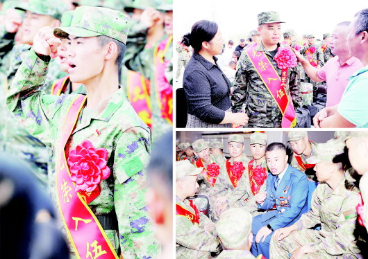 今年的9月18日是“九一八事变”92周年纪念日。在这个特殊的日子,我市在六安火车站举行2023年秋季新兵入伍出征仪式,带着家乡父老的殷殷嘱托,首批200余名踊跃应征入伍的新战士经过役前集训踏上戍边卫国的新征程。 出征仪式现场,通过学习习近平主席给安徽省潜山野寨中学新考取军校20名同学的回信精神、邀请优秀退役军人代表寄语新战友、集体进行入伍宣誓等形式,教育引导新战士要铭记历史,勿忘国耻,坚定信念,爱军精武,为祖国国防事业奉献青春和热血。 左图:新战士进行集中宣誓。右上图:新战士在与家人话别。右下图:两次荣立三等功、荣获全军优秀士官人才三等奖的优秀退役军人盛成滔向金安区新战士“传经”,鼓励他们刻苦训练,早传捷报。 本报记者 田凯平 摄