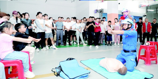 9月18日是“九一八事变”纪念日。为进一步增强全民国防意识,宣传人防知识,提高防空自救互救能力,当天上午,市国动办组织金、裕两区在裕安区月亮岛社区居民楼及地下人防工程开展了人民防空疏散实战演练活动。 此次演练按照就地就近、便于行动、便于指挥的原则进行,共分为防空人员准备、防空疏散准备、防空疏散演练、防空疏散恢复四个阶段。上午9时18分,随着一声尖锐的警报声响起,社区社区居民在引导员的组织下,关闭易燃易爆的气、电等阀门开关,携带相关防空救生物品等,开始疏散撤离,大家集结成一路纵队,沿指定路线,有序向社区地下人防工程疏散。9时28分,空袭警报再次拉响,人员全部疏散到位后,工作人员关闭双扇密闭门,打开人防排气扇。引导员开始发放防空救灾物资,检查居民身体情况,开展伤员救护治疗。蓝天救援心理防护分队人员,对居民进行了相应的心理疏导和心肺复苏培训。9时38分,警报解除,所有人员撤出演练场地。 通过演练,进一步增强了广大居民的国防观念和民防意识,提高了他们在突发公共事件下的应急反应能力。皖西学院大三学生赵冬冬说:“作为一名当代大学生,在这个特殊的日子里,我们要有居安思危意识,牢记历史,勿忘国耻,警钟长鸣,珍惜来之不易的幸福生活。” 图为六安蓝天救援队队员为居民进行心肺复苏培训。